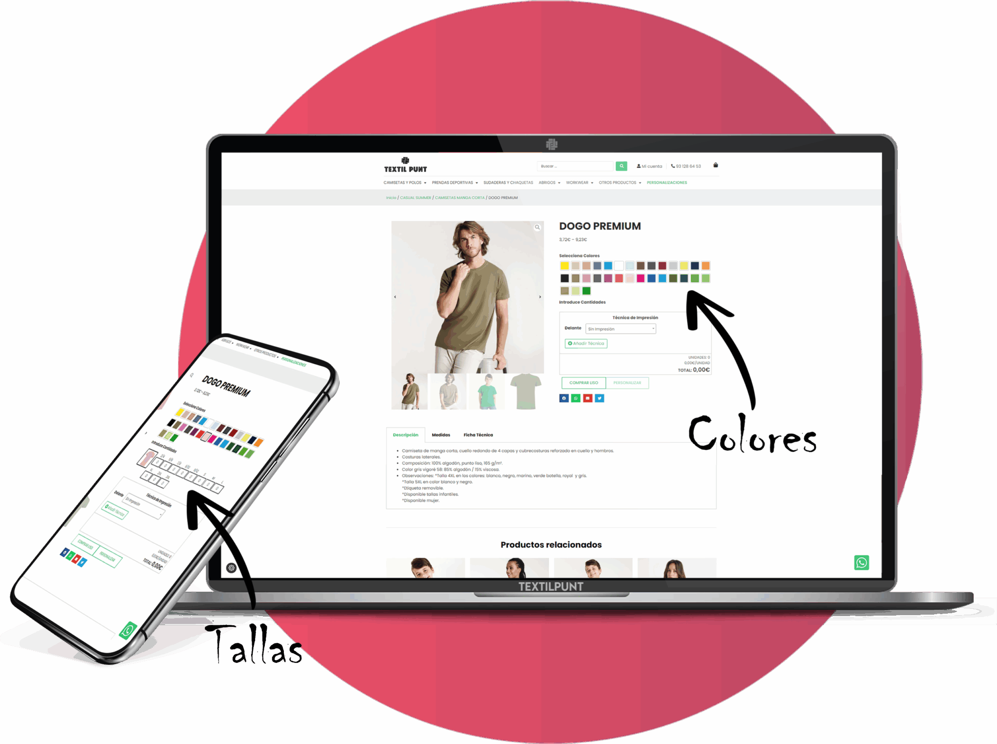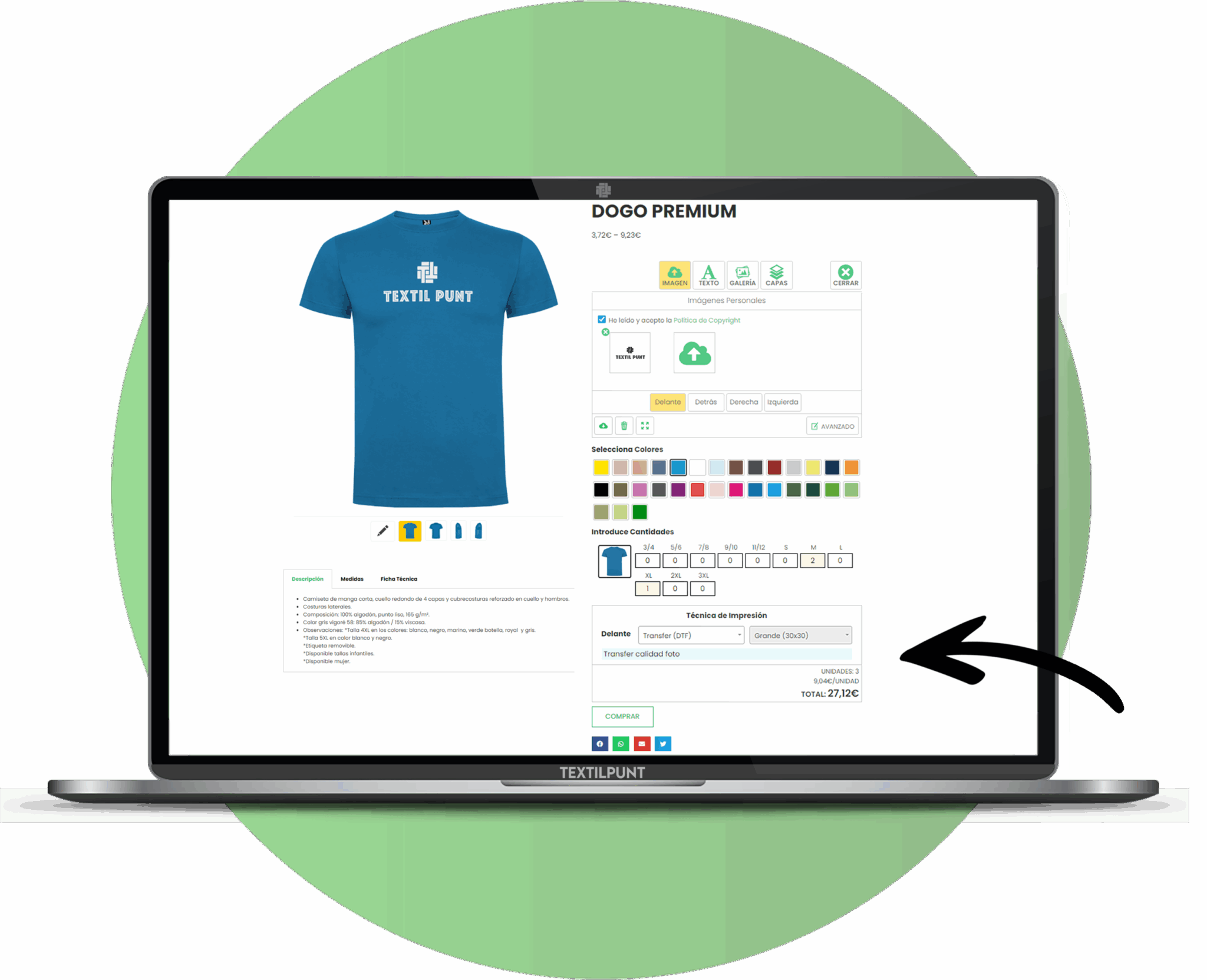 Personalizaciones PERSONALIZACIONES Saca tu lado más creativo creando tu propia obra de arte. ¡Marca la diferencia!PASOS:1) Elige modelo de prenda que se adapte a tus necesidades2) Escoge tallas y colores que desees3) Selecciona personalizar y escoge las imagenes, textos… que quieras estampar 4) Índica que técnica de impresión y tamaño deseas, en caso de no saber cual escoger puedes ver los detalles haciendo click aquí 5) Una vez finalizado, ¡no olvides añadirlo al carrito! COMO PERSONALIZAR UN PRODUCTO ESCOGE EL PRODUCTO Navega por la WEB y descubre nuevos productos para personalizar. Camisetas, sudaderas, chaquetas, ropa deportiva y mucho más. ELIGE COLORES Y TALLAS Añade los colores y las tallas que desees.Recuerda que hay descuento por cantidad.Hasta un 25% de descuento. PERSONALIZADOR Añade tus propias imágenes (recomendamos PNG)Colócalas sobre la prenda como desees.Puedes añadir »texto» y escribir lo que quieras. Escoge la vista; Delantero, trasero y mangas. Por último indica que tipo de impresión quieres en cada una de las vistas. Recuerda añadirlo al carrito ¿DUDAS? PUEDES CONTACTAR CON NOSOTROS A TRAVES DE: 685 35 35 25 93 128 64 53 INFO@TEXTILPUNT.COM Video Tutorial: