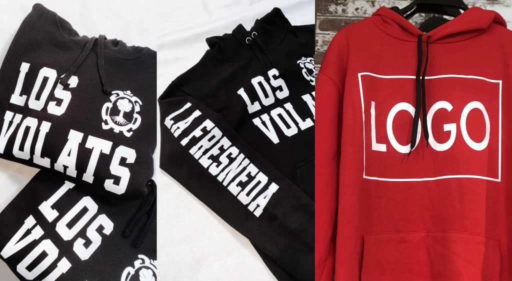 - El vinilo textil es una bobina de plástico con diferentes acabados, brillo, mate, fluor… que a través de software se corta en la forma deseada para despues extraer el plástico restante y quedarte con »el dibujo» deseado. Este posteriormente se placha encima de la prenda mediante temperatura de aproximadamente 160º y una presión media durante 10 seg.